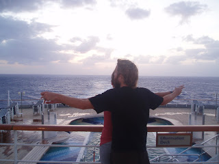 I am sitting in a lounge of a cruise looking at one of the most breath taking views I could ask for. I am in a chair that looks right over the bow of the ship and all I can see if a vast expanse of dark blue water, a multi colored late afternoon sky and lightly dusted clouds. Incredible.